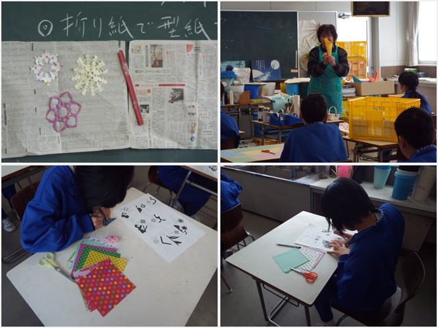 1年生が美術の時間にエコバッグづくりを行っています。生活に根ざした「身近な美術」を感じ取ってほしいというねらいから、ステンシルのプリントをしたエコバッグを作るものです。今日の1年5組の授業では、エコバッグにステンシル技法でプリントする型紙を作りました。折り紙を何度も折り返して、それを切って模様を作っていました。「どう折るのか。」「どう切るのか。」など、いろいろと予想しながらの授業となりました。完成品が楽しみです。