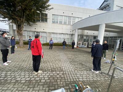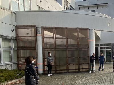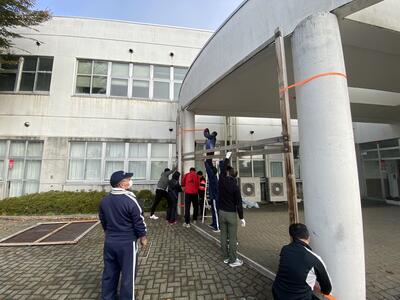 2023年11月5日 08時44分今朝は、環境整備委員と職員による雪囲い設置作業がありました。これで昇降口に雪が入らず、生徒も登校しやすいと思います。
