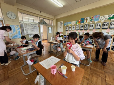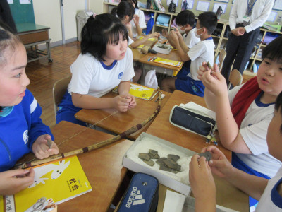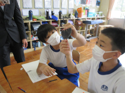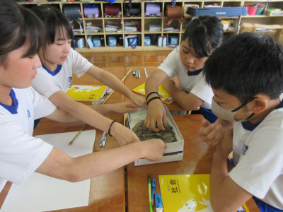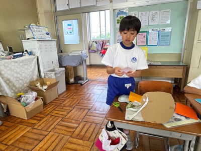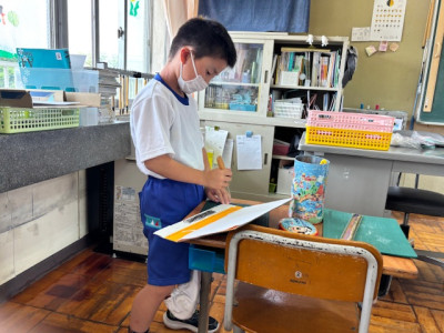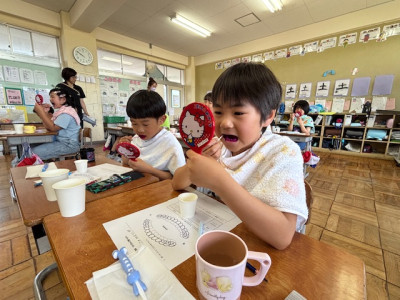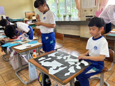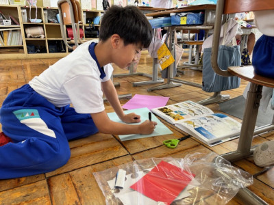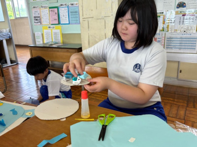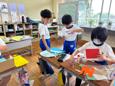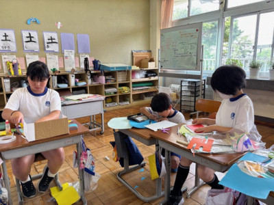 2025年12月3日 15時32分2・3年生の図画工作の時間です。2年生は空き箱や容器を組み合わせて小さな友達の家を作っていました。友達が喜ぶようにと、いろんな工夫を考えて作っていました。私にも、家の中の様子を詳しく説明してくれました。3年生は観光地によくある、写真撮影用の顔出しパネルのような物を作っていました。一人一人思い思いの絵を描いて顔を出します。みんなどんな世界が作り出されるのでしょう?どちらの学年も完成が楽しみですね。