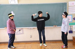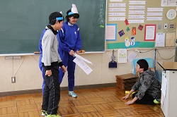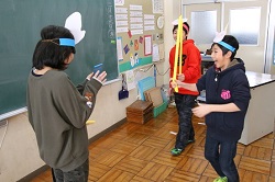 2017年2月17日 16時29分 2月16日(木)の5校時目、6年生の外国語活動の一環として4~5名のグループで「桃太郎」の話を英語劇にして発表する活動が行われました。初めのうちは声も小さかったり演技の身振りも小さかったりで、思うような演技にならないところもありましたが、緊張がほぐれてきてからは、練習の成果を発揮して楽しそうに演技できるようになってきました。なお、詳しい様子については「活動のようす」のページにアップしましたので、そちらもご覧ください。