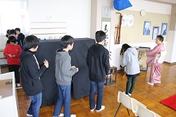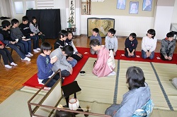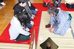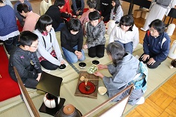 2017年3月1日 14時44分 3月1日(水)の3・4校時、茶道宗徧琉の田部宗芳社中より田部宗芳先生はじめ4名の講師の先生方にご来校いただき、音楽室を会場に6年生の「卒業お茶会」が行われました。教頭先生から講師の先生の紹介があった後、田部先生から茶道の心や心構え、作法などについてお話がありました。その後、2班に分かれてお茶を点てていただき、抹茶を味わいました。次は、3班に分かれて子どもたちが自分でお茶を点てる体験も行いました。また、3年間お茶クラブで活動していた児童に、「学習証書」と記念品もプレゼントされました。最後に児童代表から御礼のことばを述べてお茶会が終了しました。なお、詳しい様子については「活動のようす」のページにアップしてありますので、そちらをご覧ください。