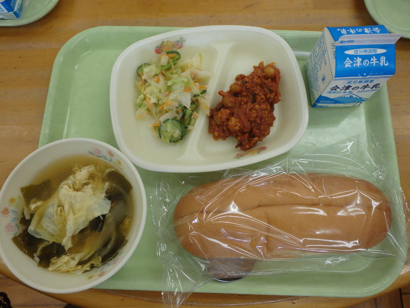 2019年6月6日 14時07分6月6日(木)の給食の献立は、「たまごスープ・チリコンカン・キャベツとツナとサラダ・背割れコッペパン」でした。
