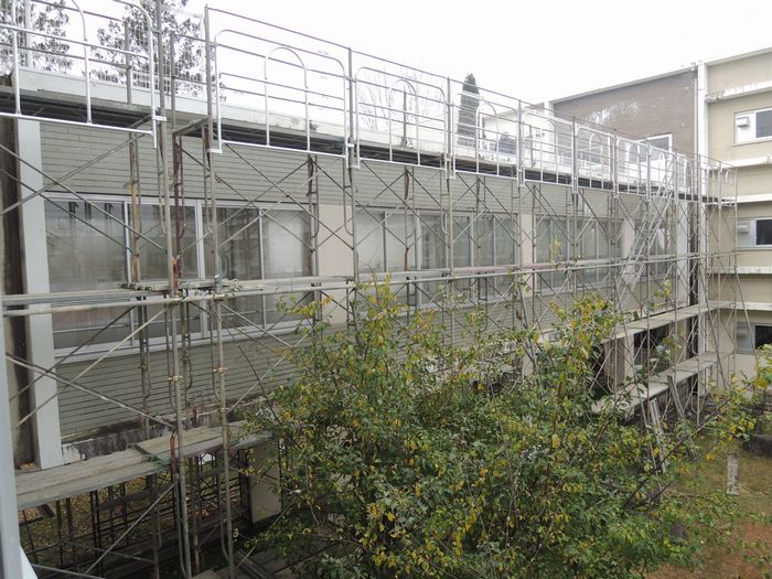 3階西渡り廊下への屋根掛け作業のため足場が組み立てられました。
