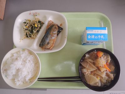 2015年1月14日 13時01分本日の献立 : 麦ごはん、味のり、鯖のみそ煮、おひたし、豚汁