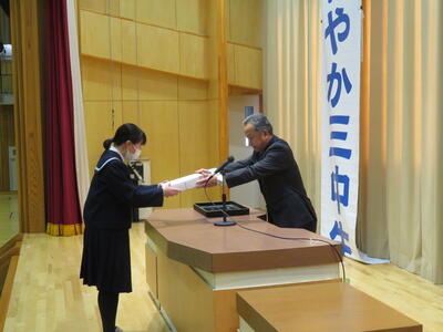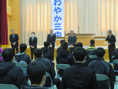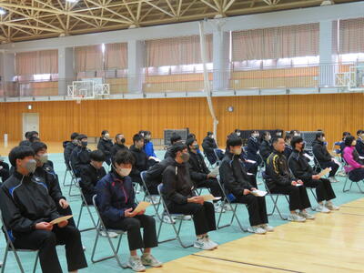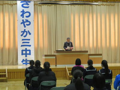 2024年3月8日 16時06分今日は5校時目に同窓会会長の羽曽部勇一様を始め5名の同窓会役員の方をお迎えし、同窓会入会式を行いました。今回、3年生64名が入会し本校の同窓生は1,833名になります。