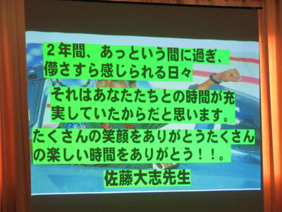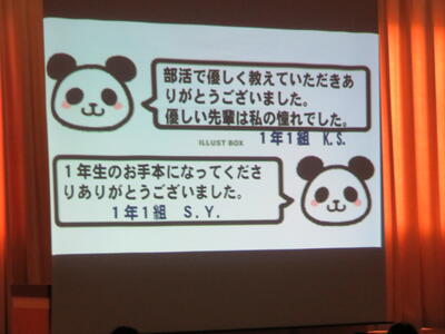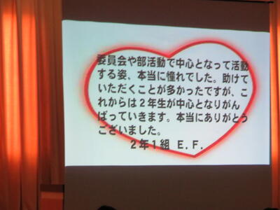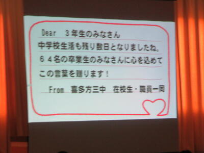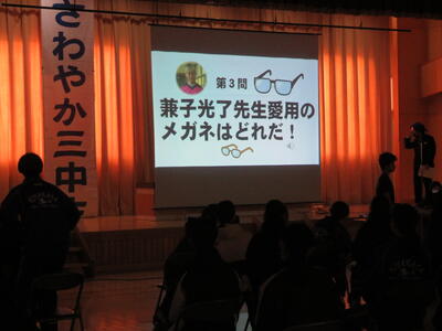 6校時目は3年生を送る会が行われました。生徒会役員が中心となって、クイズやメッセージ、スライドショーなどを行い、とても楽しいひとときを過ごすことができました。