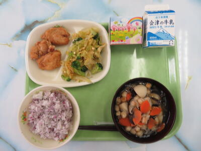 ※今日の給食は卒業お祝い献立て、ゆかりごはん・牛乳、こづゆ、とりのからあげ、ブロッコリーとチーズのおかかあえ、お祝いケーキでした。