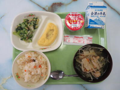 ※今日の給食は、手作りえびピラフ、肉団子スープ、ミートオムレツ、小松菜サラダ、ヨーグルトでした。