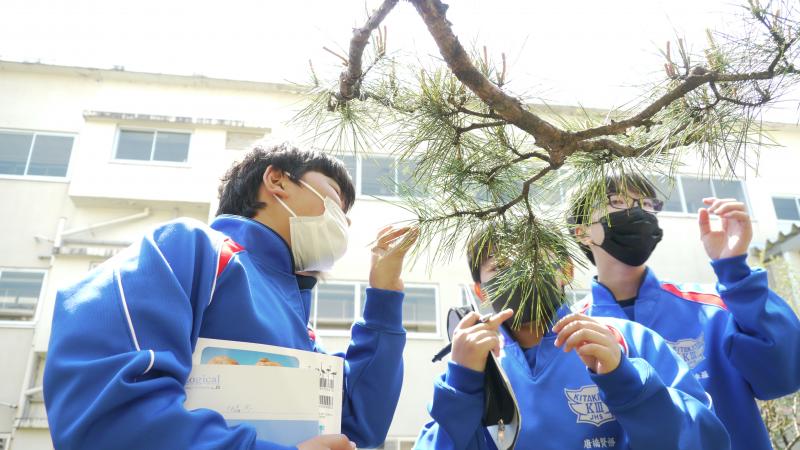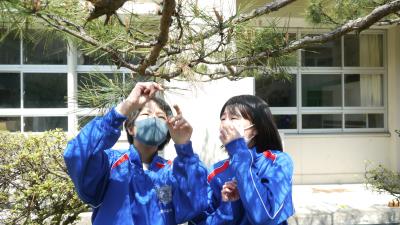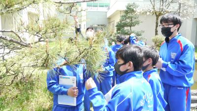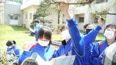 2021年4月20日 13時28分4月20日(火)、1年1組の理科の授業は、中庭にある松の花を調べる授業でした。生徒は、実際の松の花を手にとって、教科書を見比べながらしっかりと学習に取り組んでいました。ICTを活用した学習も大切ですが、本物の植物教材を活用しながら、五感をフル活用する授業も大切です。生徒の「わかった~。」という、声があちらこちらで聞こえました。