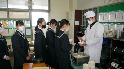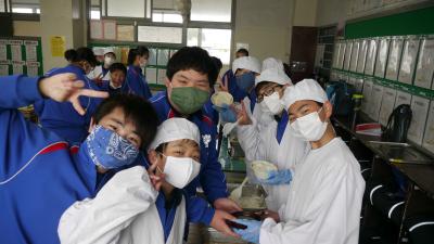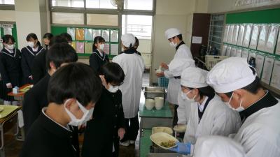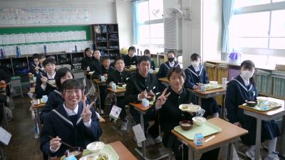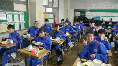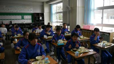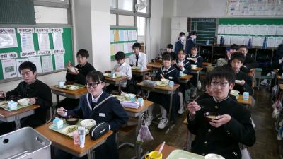 2021年4月28日 13時24分2年生の給食の様子です。コロナウイルス感染症対策として、対面形式ではなく、全員が正面を向いて給食を食べるようにしています。