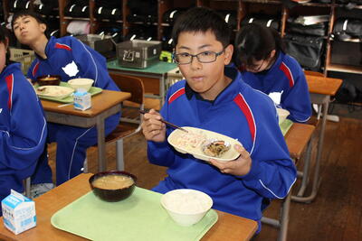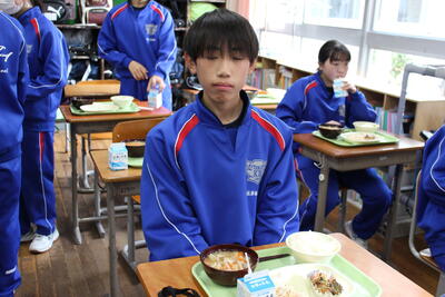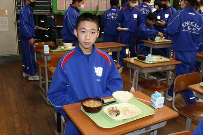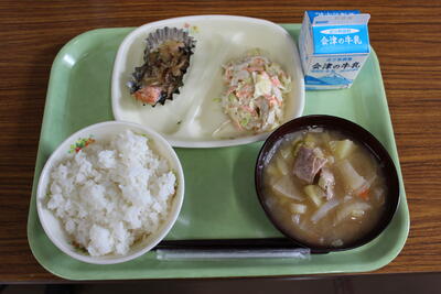 2021年12月13日 13時15分12月13日(月)、今日の給食の献立はごはん、牛乳、野菜たっぷり豚汁、さけときのこのバターホイル焼き、ごぼうサラダでした。「さけときのこのバターホイル焼き」は1年の佐原くん、「野菜たっぷり豚汁」は、1年の清水くん、「ごぼうサラダ」は1年の五十嵐くんが考案したメニューです。どの献立にもビタミンCが多く含まれ、傷の回復や病気になりにくい体づくりに役立ちます。ぜひ、お家でも作ってください。ごちそうさまでした。