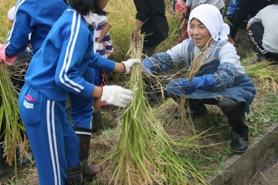 上級生が下級生に教えながら稲刈りをする微笑ましい姿が見られました。
