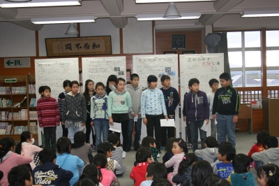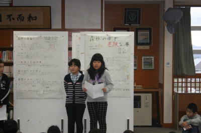 11月27日(金)、5年生による発表集会がありました。10月に、中山森林公園に行き、森の案内人の方から学んできたことや木工クラフトの体験などを、班ごとに模造紙にまとめ発表しました。聞いていた他の学年の児童も、たくさん感想を発表していました。