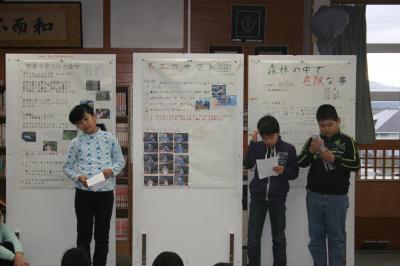 2015年11月30日 12時28分 11月27日(金)、5年生による発表集会がありました。10月に、中山森林公園に行き、森の案内人の方から学んできたことや木工クラフトの体験などを、班ごとに模造紙にまとめ発表しました。聞いていた他の学年の児童も、たくさん感想を発表していました。