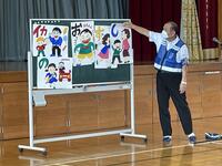子どもたちが避難した体育館では,喜多方市警察署生活安全課少年補導員及びスクールサポーターのお二人を講師に招き,「いかのおすし」の大切さ,登下校時・遊んでいるときの不審者への対処の仕方を具体的に教えて頂きました。また,いかにも怪しい人だけが不審者ではなく,優しそうな人などが怖い人ということもあるので,知らない人に声をかけられたときは,距離をとることを教えて頂いたことが印象的でした。子どもたちは,最初から最後まで真剣な表情でお話を聞き,今後の生活に役立てようという気持ちになっていることが感想発表や聞いていた子どもたちの表情からもうかがえました。ご協力いただいた警察署の方々,ありがとうございました。