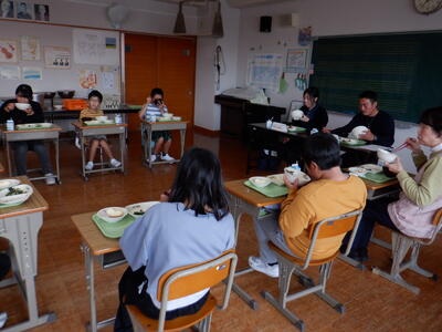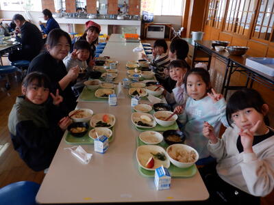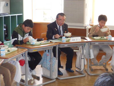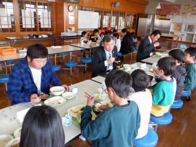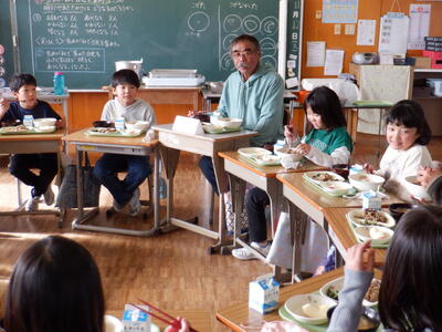 本日の主食は、会津牛を使用した牛肉丼です。各学級では、まず生産者の方に感謝の言葉を述べ、感謝状をお渡ししました。その後、スペシャルメニューの給食を一緒にいただきながら、お招きした方々と楽しいひとときを過ごしました。初めて生産者さんを前に給食を食べた子ども達は、改めて食に対する感謝の気持ちを高めたようです。