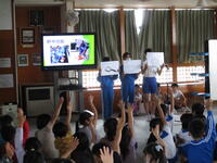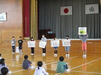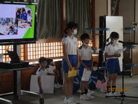 6月2日(金)の児童集会では、飼育栽培委員会の発表がありました。学校で飼っているカメとコイに関するクイズをした後、2匹のコイの名前を募集しました。決定したコイの名前は「きび」と「たん」。2匹合わせるとどこかで聞いたような! いつも水槽の掃除やえさやり等お世話をしてくれている飼育栽培委員でした。