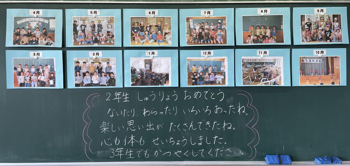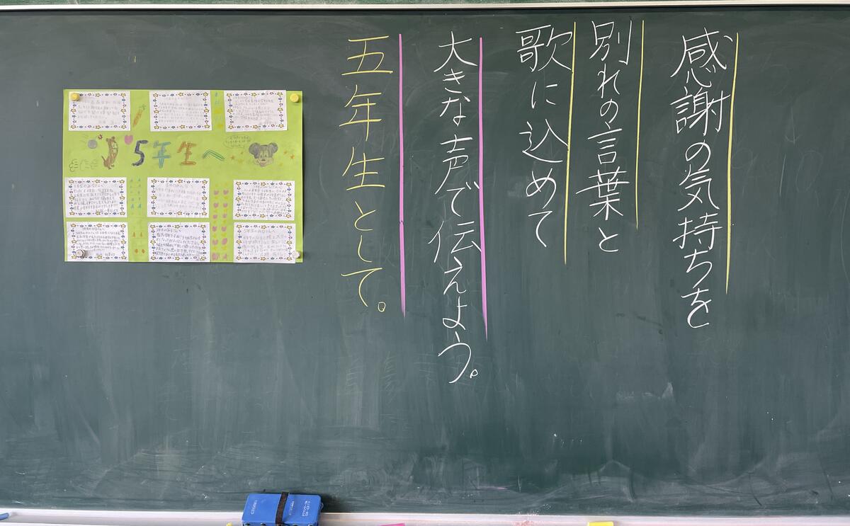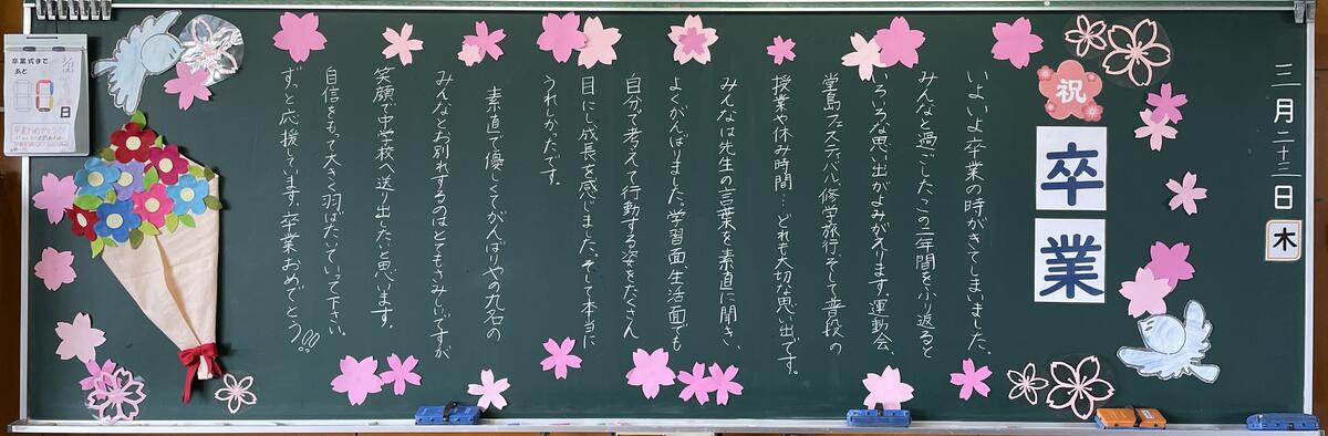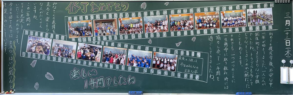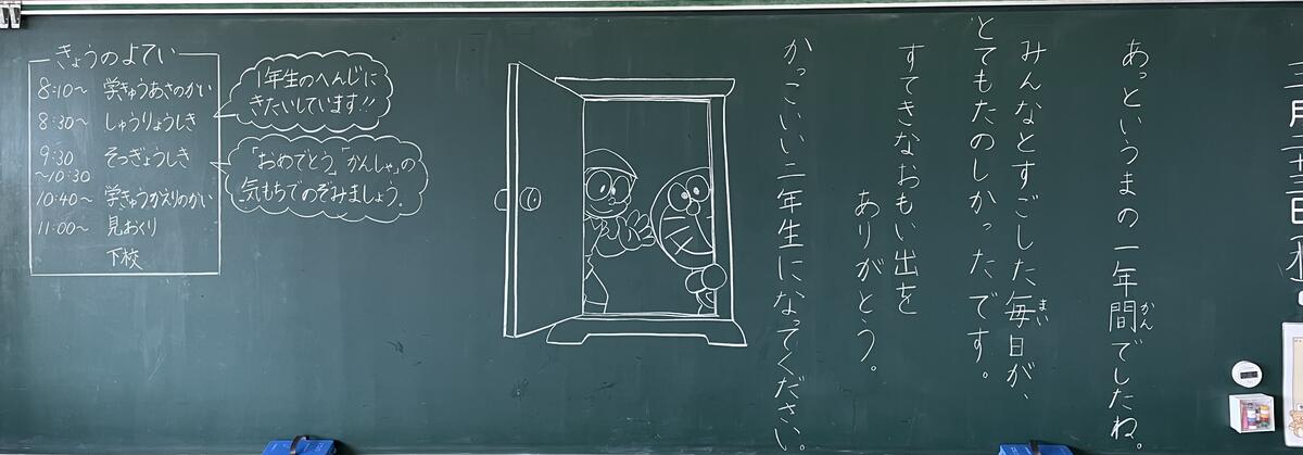 春休み1日目。今朝は規則正しく起きられたでしょうか?子ども達がいない校舎はひっそりと静まりかえっています。そこで、昨日の各教室の黒板に書かれた担任からのメッセージを掲載します。