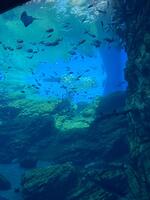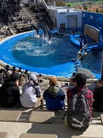 青い水の中の世界、幻想的でいいですよね。太陽の下でのイルカショー、ジャンプの高さに驚いていたようです。