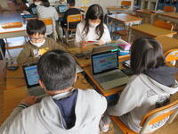 国語科の学習で、『1年生が本を好きになってくれる読み聞かせをする』という目的で、進行を考えながら話し合いをしてきた3年生。タブレットを使いながら班の意見を整理し、10分で読み聞かせができる本を決めました。