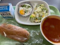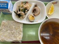 今日の給食は、「大好き喜多方の日献立」ということで、喜多方ラーメン、煮卵、焼き豚、わかめと大根のサラダ、オレンジ、牛乳でした。特に焼き豚は、お店で出されるような厚さの本格的なもので、子ども達も満足そうな顔で食べていました。