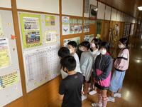 全校朝の会終了後に,早速5年生は「学年パワーアップチャレンジ月間」の記録表が貼られている職員室前に集まり,学年対抗となるこの取り組みに対しての意欲付けを行っていました。「実りの多い秋」を目差して,全校生で頑張ります。