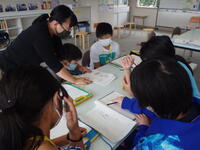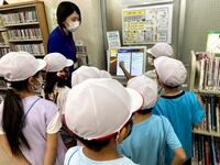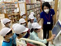 まずは、図書館の中を案内していただき、本の借り方や返し方、検索機の使い方を詳しく教えていただきました。また、今は本の除菌をする機械もあり、実際に本の除菌をする場面を見て、子どもたちは驚いていました。