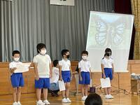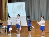 今日の発表集会は,3年生の発表が行われました。スクリーンに映し出される写真や絵をバックに,10人の児童一人一人が夏休みの思い出を発表することができました。