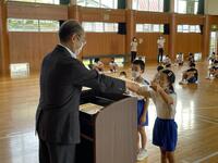 その後,理科研究物展の賞状伝達や,教務主任から地球温暖化防止のために,電気・水の無駄遣いをやめる意識を持つようにしようという話がありました。