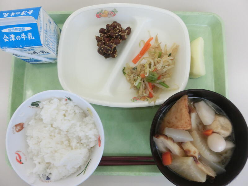 <メニュー> ごはん、豆みそ、三色和え、おでん、りんご、牛乳
