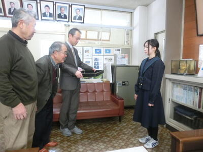 2025年1月21日 16時55分県スキー大会で入賞し、東北中学校スキー大会への出場権を得た選手に、本校同窓会の会長様、副会長様が来校し、激励金が手渡されました。