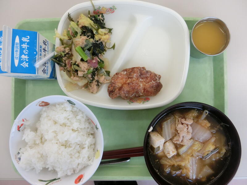 <メニュー>【リクエスト献立】加納小5・6年大好きメニュー ごはん、鶏のから揚げ、海藻サラダ、キムチチゲ、みかんゼリー、牛乳