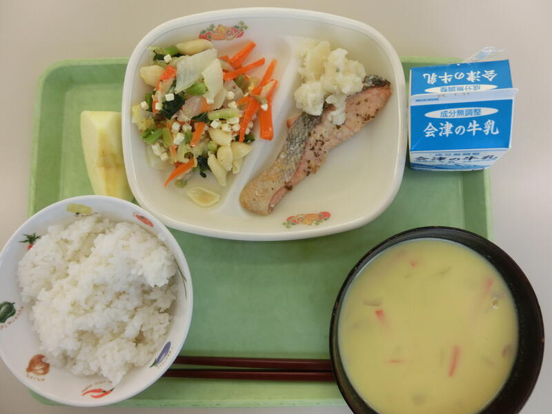 <メニュー> ごはん、鮭のムニエルマッシュポテト添え、フレンチサラダ、コーンポタージュ、りんご、牛乳
