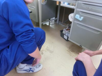 メラミンスポンジに水を含ませて、床についた黒ずんだ汚れを落とす作業です。