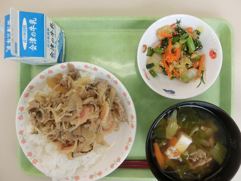 <メニュー> マッシュルーム入り豚肉丼、ごま和え、中華スープ、牛乳