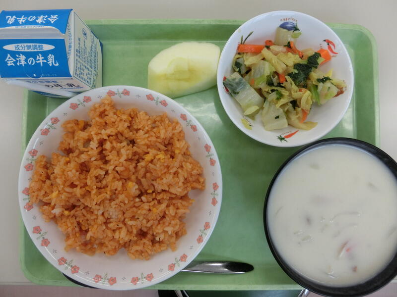 <メニュー> チキンライス、白菜サラダ、シチュー、りんご、牛乳