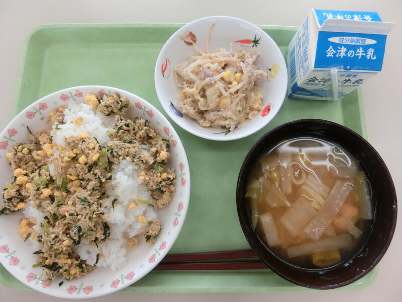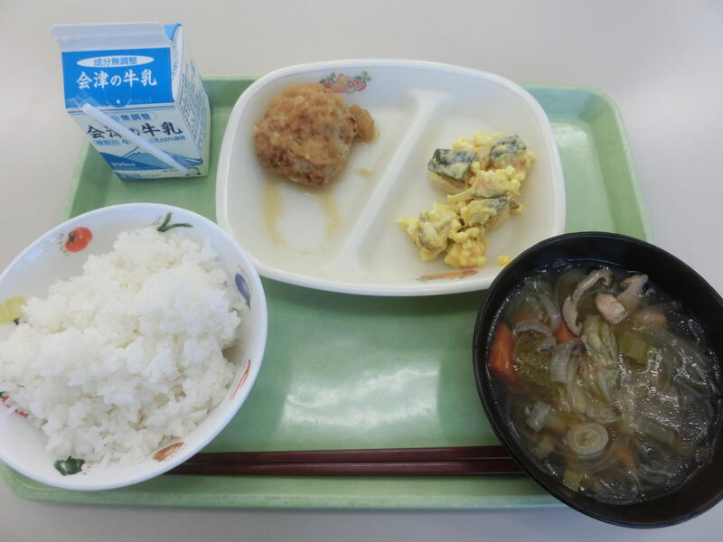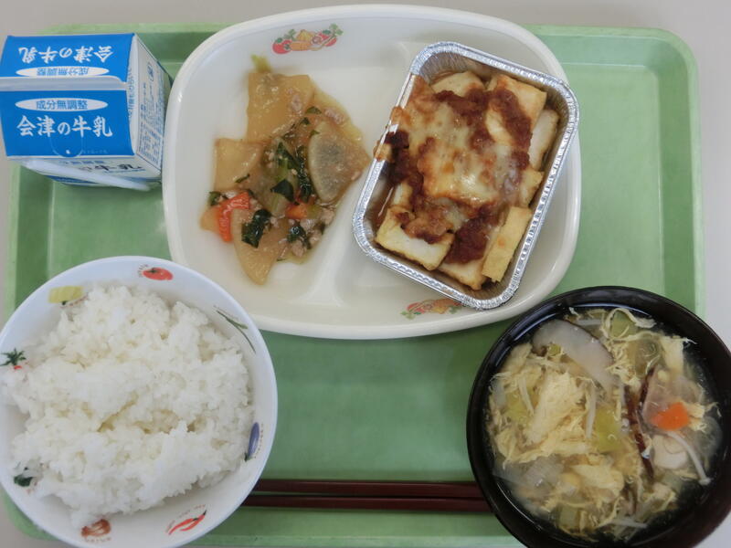 <メニュー> ごはん、厚揚げのチーズ焼き、大根のそぼろ煮、かき玉汁、牛乳