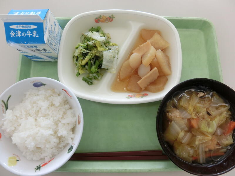 <メニュー> ごはん、いか大根、かおり和え、肉だんごスープ、牛乳