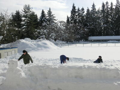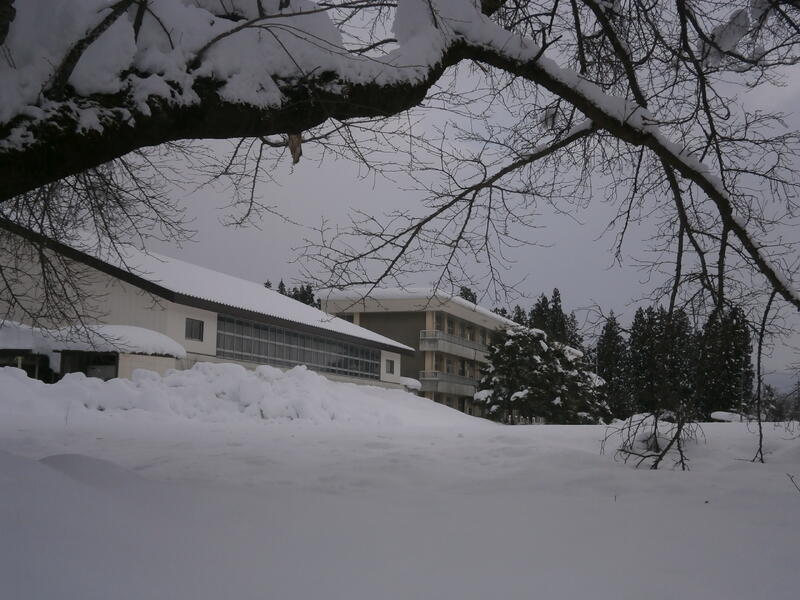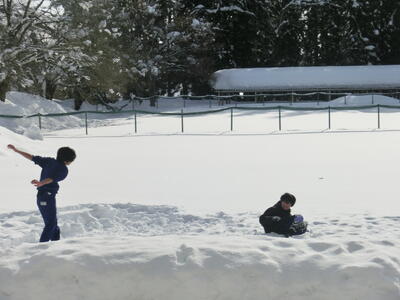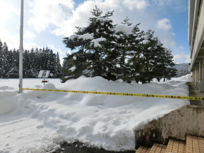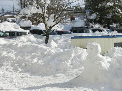 校庭は厚い雪で覆われ、テニスコートや部活動倉庫も半分以上埋まってしまいました。