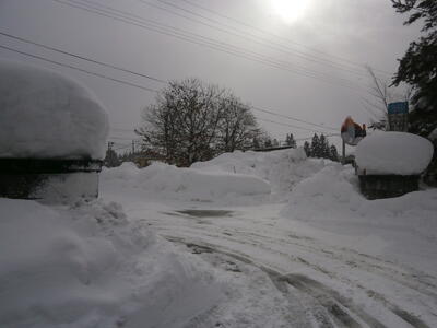校門前の十字路はご覧の通り、雪で道幅は狭くまた、光の当たり方や、雪の降り方によってはホワイトアウト(一面真っ白)現象により、雪の端や車等が見えにくい状態となります。