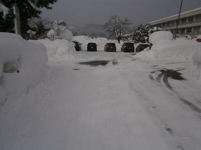 本日の積雪はさほどではありませんでしたが、時より吹雪いて視界が悪い上に、これまでの積雪で中学校周辺は交通安全に十分な注意が必要な状況が続いております。