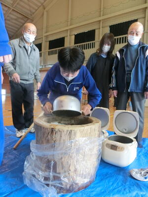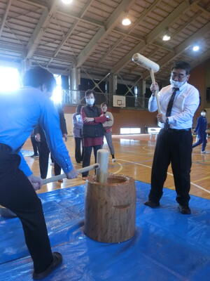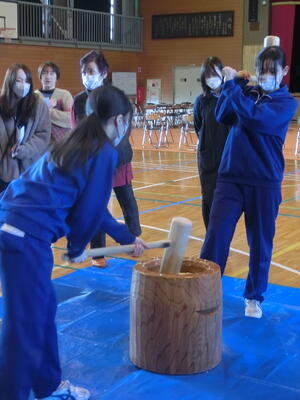 熱々の米をうすに入れ、全校生と保護者の皆様、お招きした地域の方々、職員が総出できねを手に取り、もちつきを行いました。