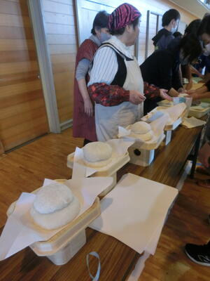 収穫祭が始まる前に、PTA厚生委員の皆様と職員で、つゆもちの準備を行っていただきました。