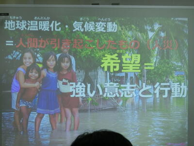講演では、キリバスの大変素晴らしい環境、そこで暮らす人々の生活、しかし、今、二酸化炭素排出量が世界で2番目に低いキリバスが、先進国(日本は排出量第5位)をはじめ、他の国々の出す二酸化炭素のために今や埠頭のみならず、住民が暮らす家や学校まで海が高まり押し寄せ、沈みゆく現状、小学生は先生の分しか教科書がない(子どもの教科書はない)「最貧国」であるキリバスには削られた箇所の修理もままならない、今のキリバスの子どもたちは10年後、20年後、もしかしたら住む場所も、国もなくなっているかもしれないなどの現状の話を聞きました。「ふるさとを失う」ことの痛みは、この福島県が痛いほどよく分かっていることでもあり、人ごとではないことをひしひしと感じる内容でした。