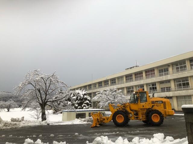 朝早くから教頭先生、用務員さんが雪かきをしていると、出動していただいた大きな除雪車が現れ、駐車場を一面、きれいに除雪していただきました。