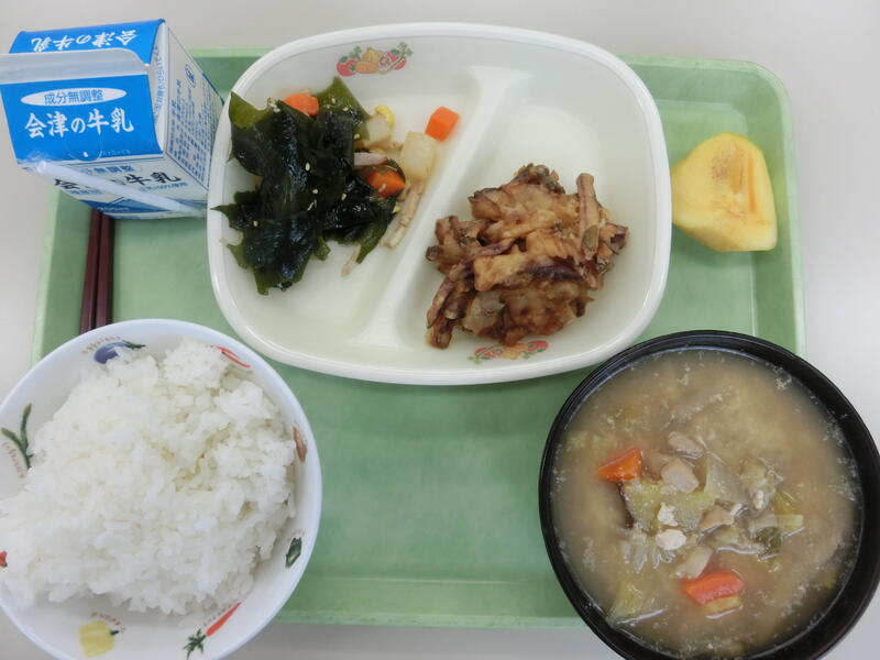 <メニュー>【サンマルちゃん献立】ごはん、かき揚げ、大根のころころサラダ、飛鳥汁、柿、牛乳