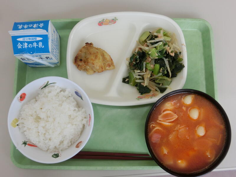 <メニュー> ごはん、タンドリーチキン、ごまじょうゆ和え、ミネストローネ、牛乳