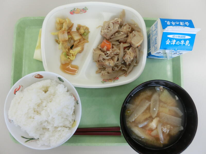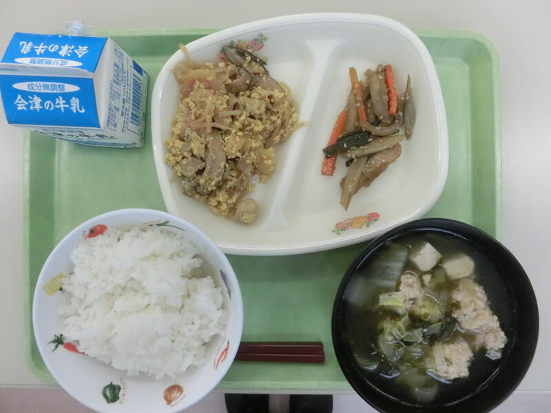 <メニュー> ごはん、親子煮、くきわかめのきんぴら、ちゃんこ汁、牛乳