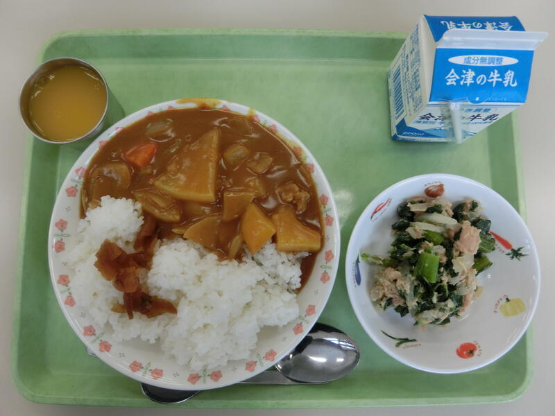 <メニュー> ごはん、根菜カレー、福神漬け、小松菜サラダ、みかんゼリー、牛乳