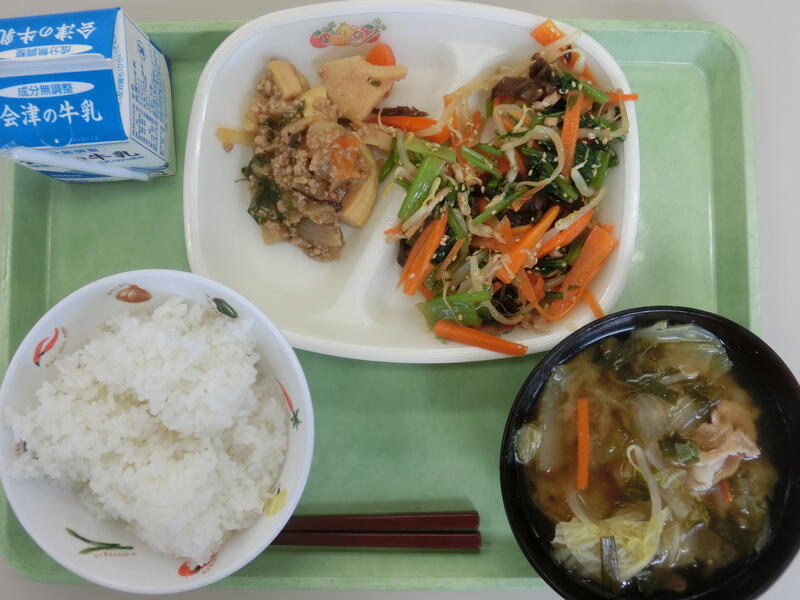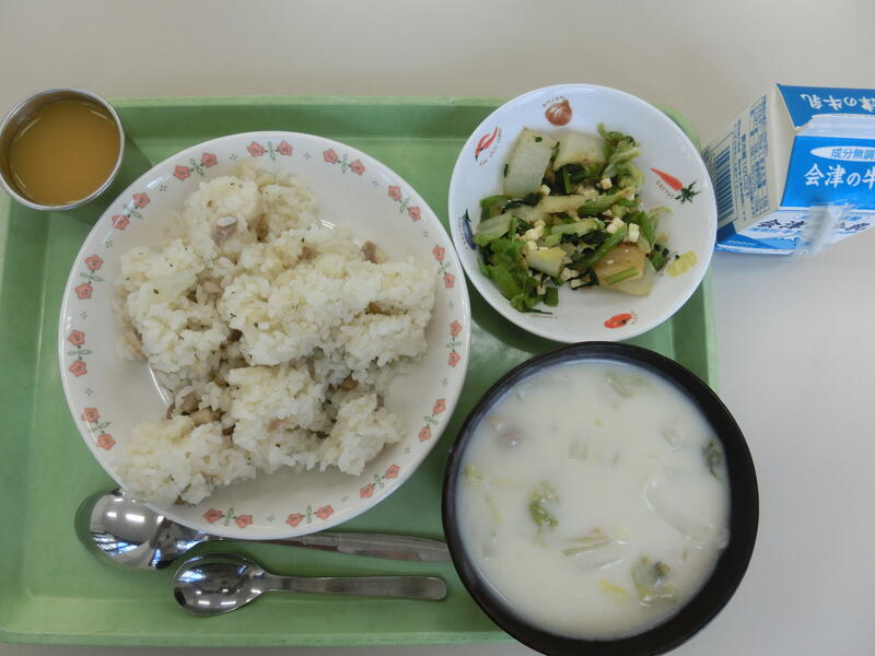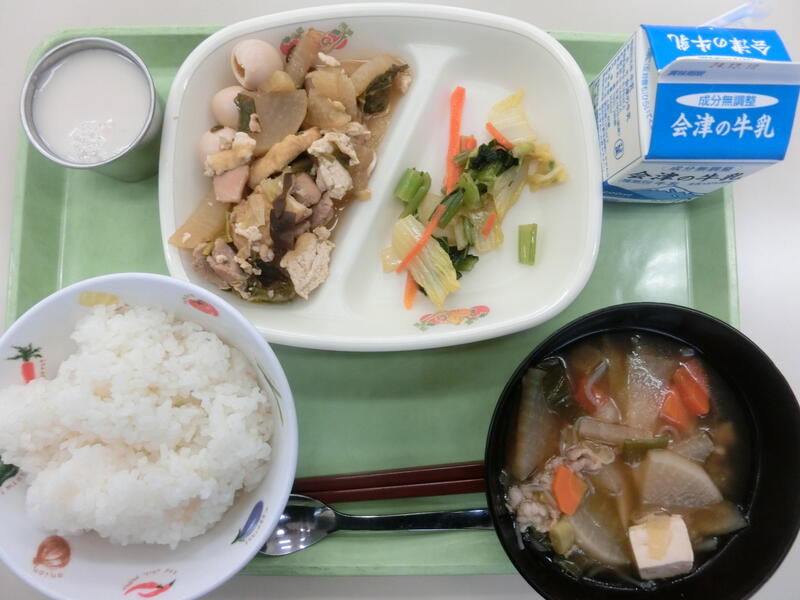 <メニュー> ごはん、大根のオイスターソース煮、白菜サラダ、豚汁、ミルク寒、牛乳